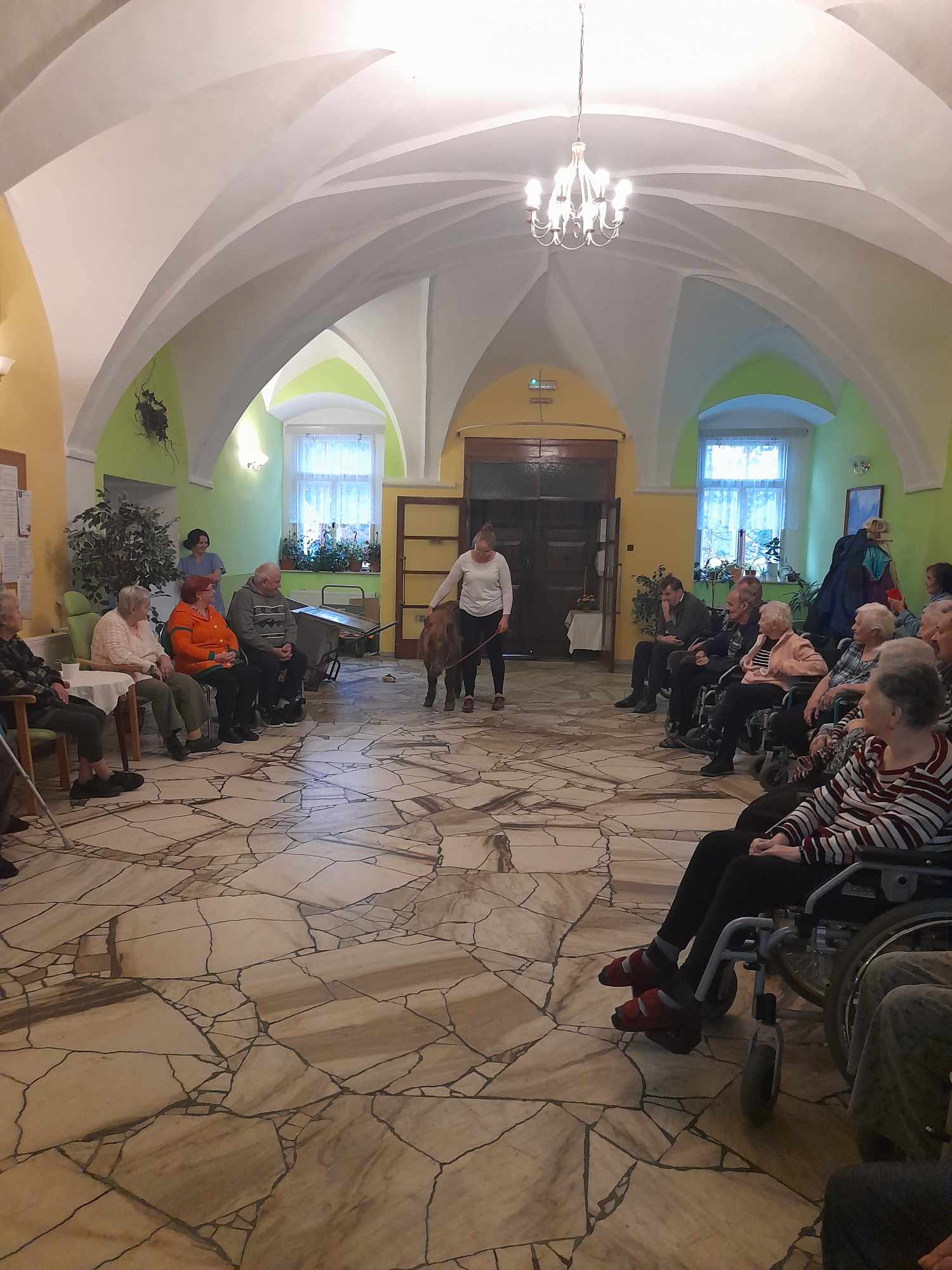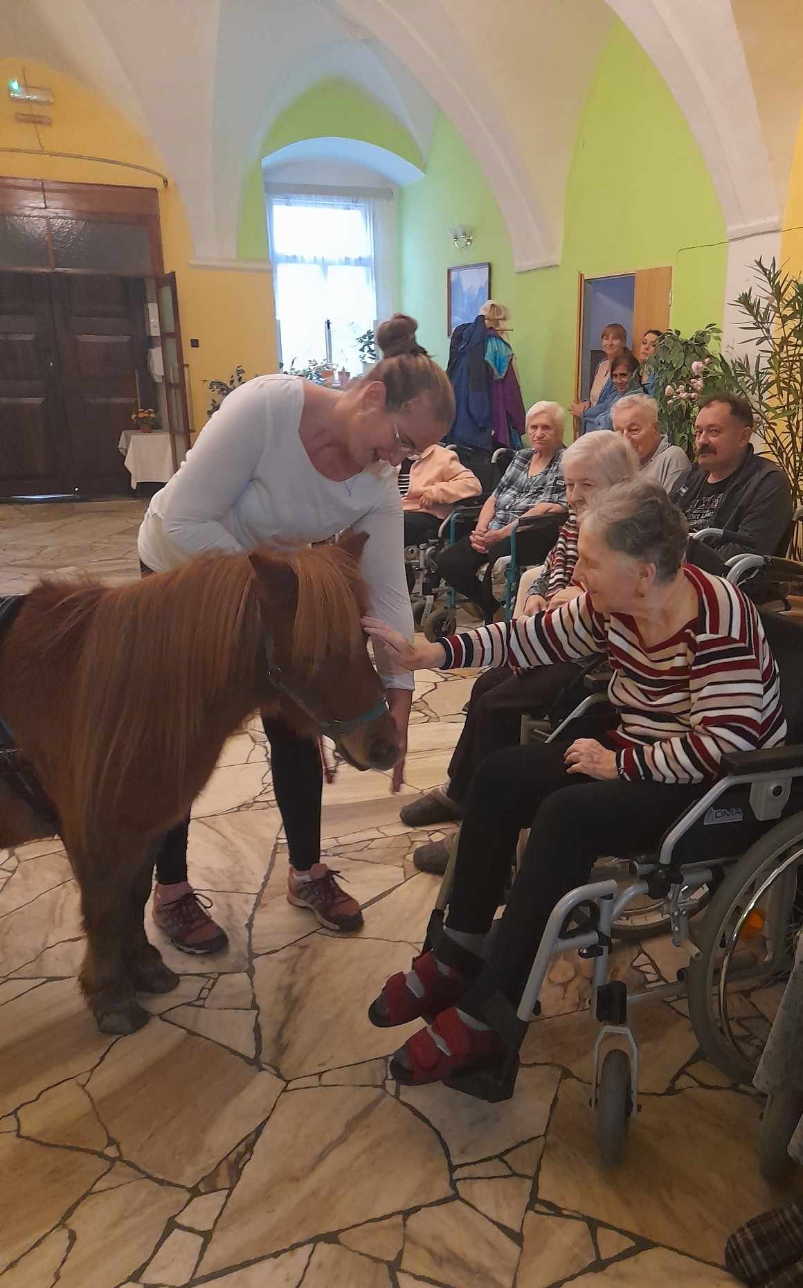 Dnes u uživatelů na budově B3 proběhla aktivita s prvky zooterapie. Uživatele navštívila paní s poníkem. Akce se konala na hale v přízemí. Uživatelé měli možnost si poníka Sofii pohladit, dát jí pamlsek, poslechli si informace o chovu poníků, jak je o ně pečováno apod. Uživatelům se akce velmi líbila. Kontakt s němou tváří vždy rádi uvítají.