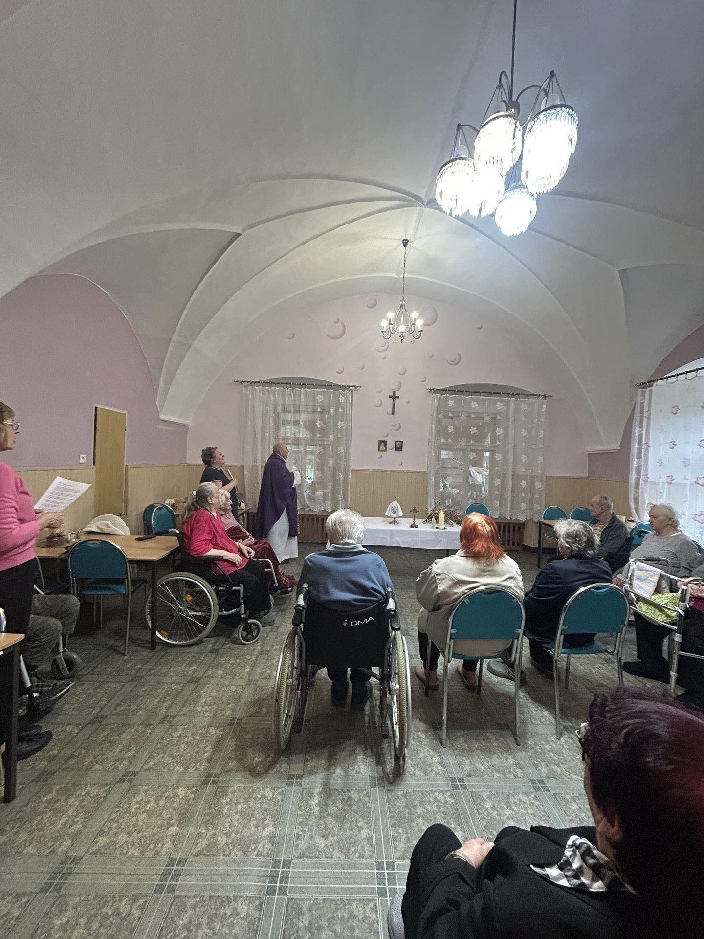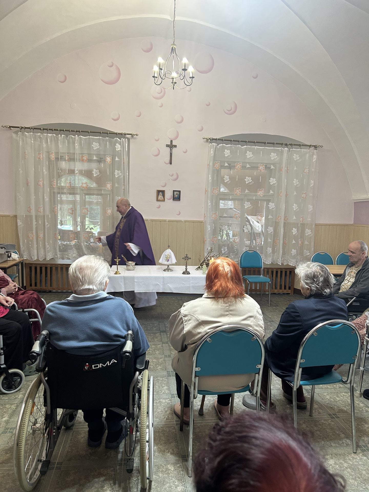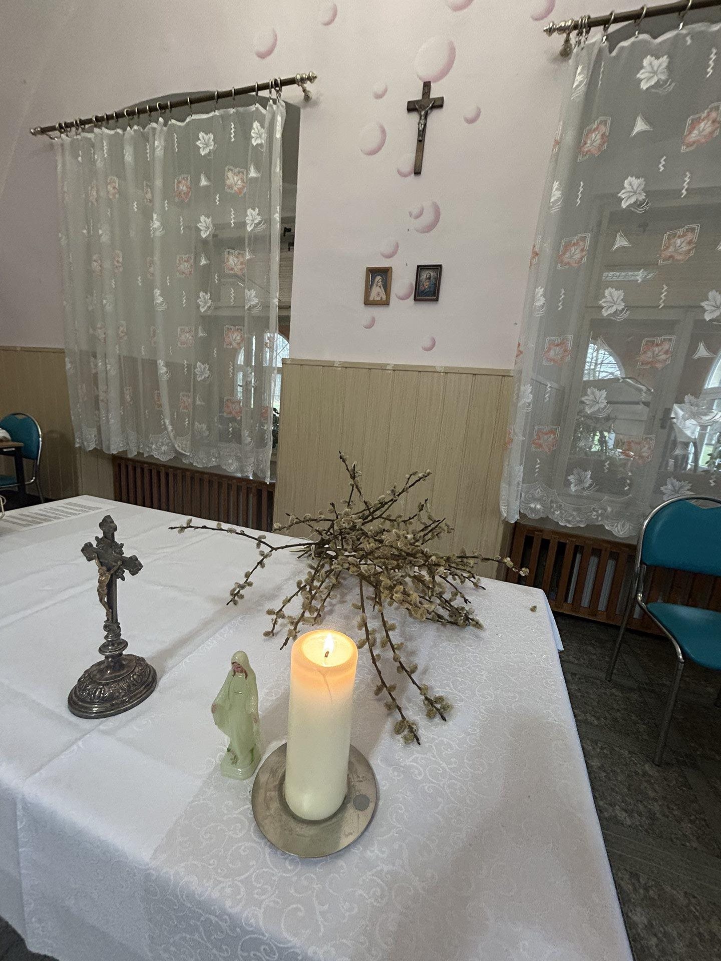 Velikonoční bohoslužba probíhala v jídelně v přízemí, sloužil ji pan Otec Mgr. Miroslav Kadlec. V Pašijovém týdnu pan farář hovořil o utrpení, smrti a vzkříšení Ježíše Krista, posvětil nám ratolesti (kočičky), proběhla společná modlitba a udělení svatého přijímání. Navštívil také imobilní uživatele na pokojích, kteří se společné bohoslužby nemohli účastnit.